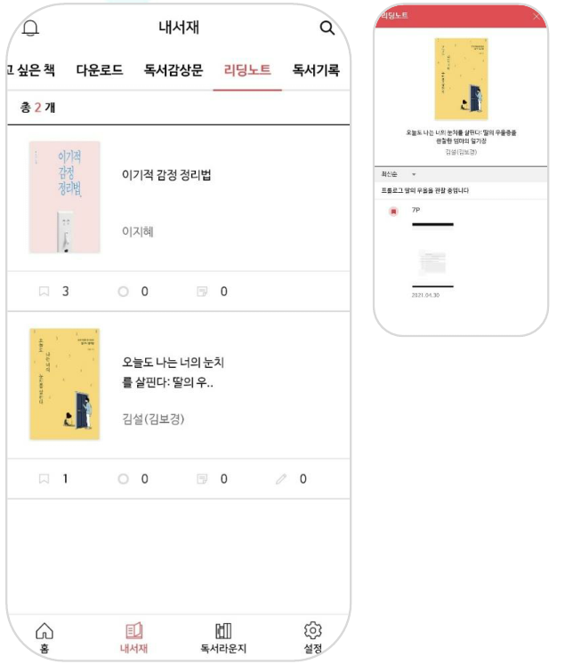 책을 읽으면서 중요하다고 생각한 부분은 하이라이트로 표시하고, 생각나는 점은 메모로 남길 수 있어요. 이렇게 만든 책갈피, 하이라이트, 메모는 '리딩노트'에서 한눈에 모아볼 수 있답니다. 페이지 정보와 함께 기록되어 나중에 다시 찾아보기도 편리해요. |