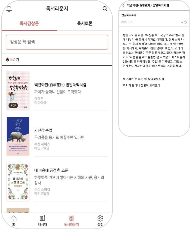 독서 라운지의 '독서 감상문' 메뉴에서는 다른 사용자들이 작성한 다양한 감상문을 읽어볼 수 있어요. 도서명을 검색해 특정 책에 대한 감상문을 찾아볼 수도 있고, 독서감상문이 작성된 도서 리스트를 살펴볼 수도 있답니다. 마음에 드는 감상문에는 '좋아요' 버튼을 눌러 공감을 표현할 수도 있어요. |