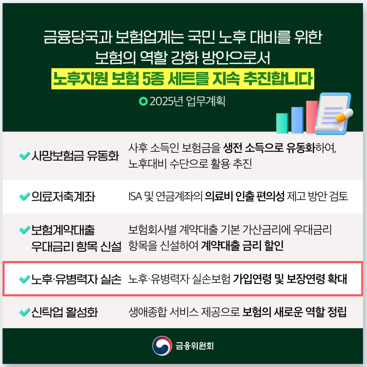 마침 금융위원회에서 고령화 시대를 맞아 금융위원회가 '노후지원 보험 5종 세트'를 추진하겠다는 소식을 듣고 바로 알아보았습니다.
