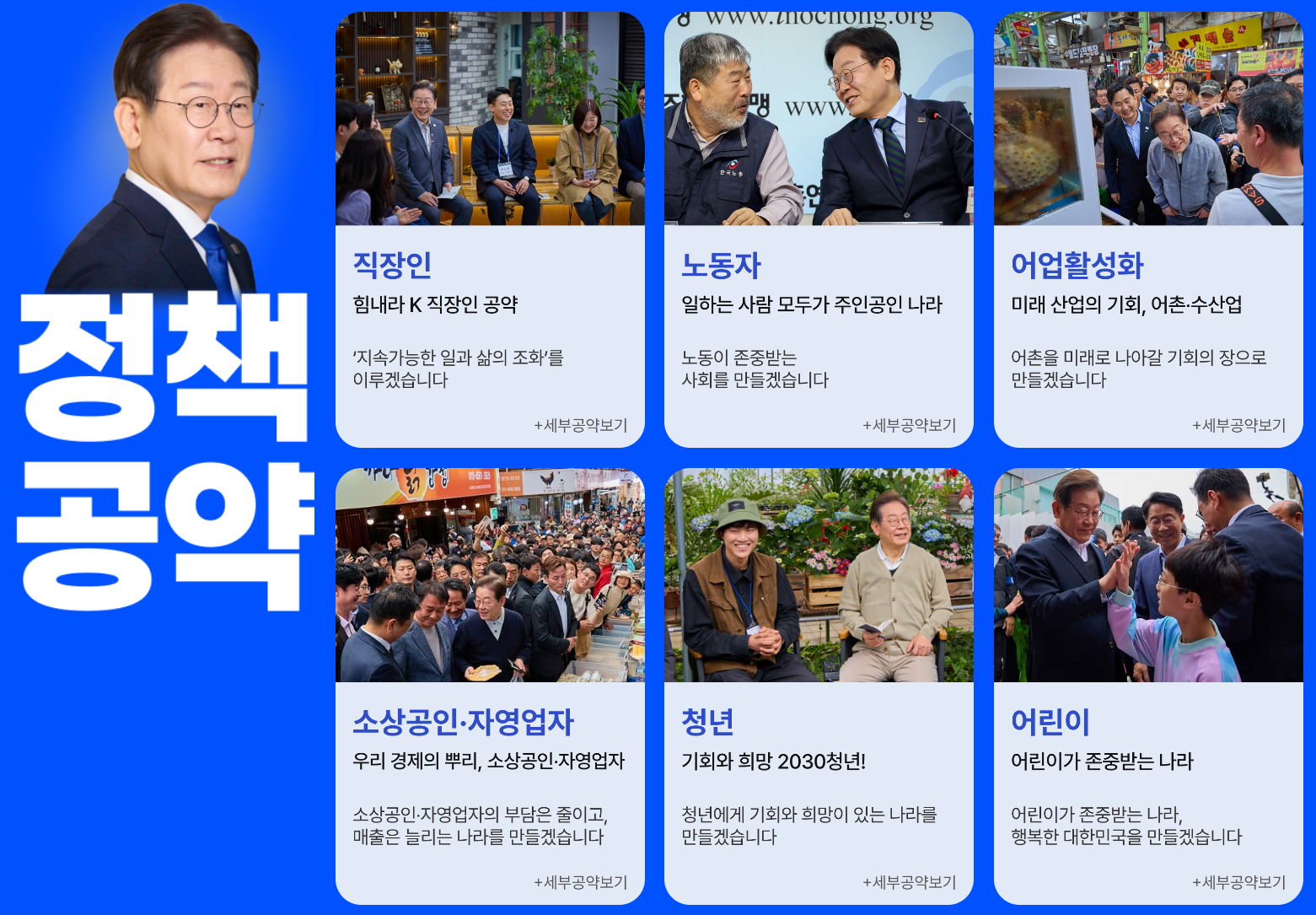 의료개혁, 지역의사·공공의료 인력 확충, 국민참여형 의료개혁 공론화, 소득보장·아동수당·연금개혁, 청년·1인가구 지원 등 생활안정과 복지 확대를 강조합니다. - 노동·권리: