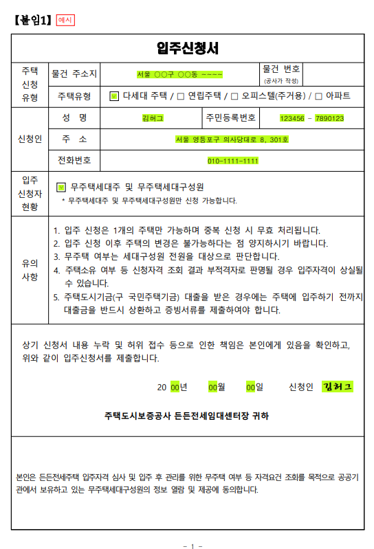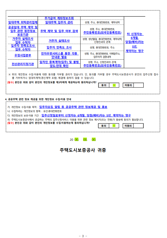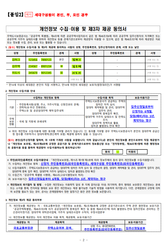 - 개인정보 수집·이용 및 제3자 제공 동의서(세대원 전원 자필 서명)