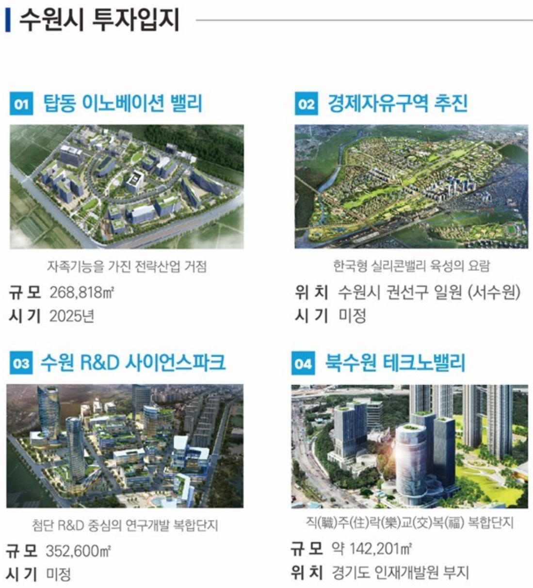 수원시는 최근 다양한 개발 호재를 통해 도시 경쟁력을 강화하고 있습니다. 아래는 주요 개발 사업과 구체적인 내용을 정리한 것입니다.