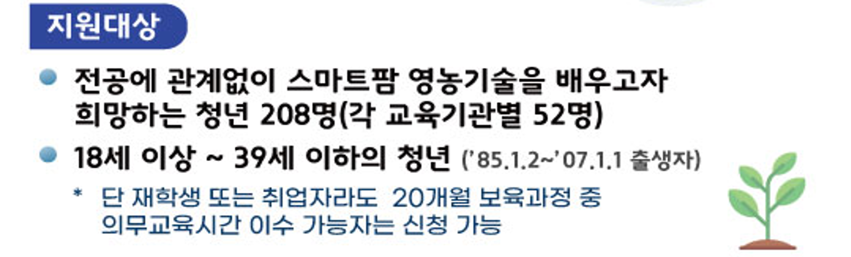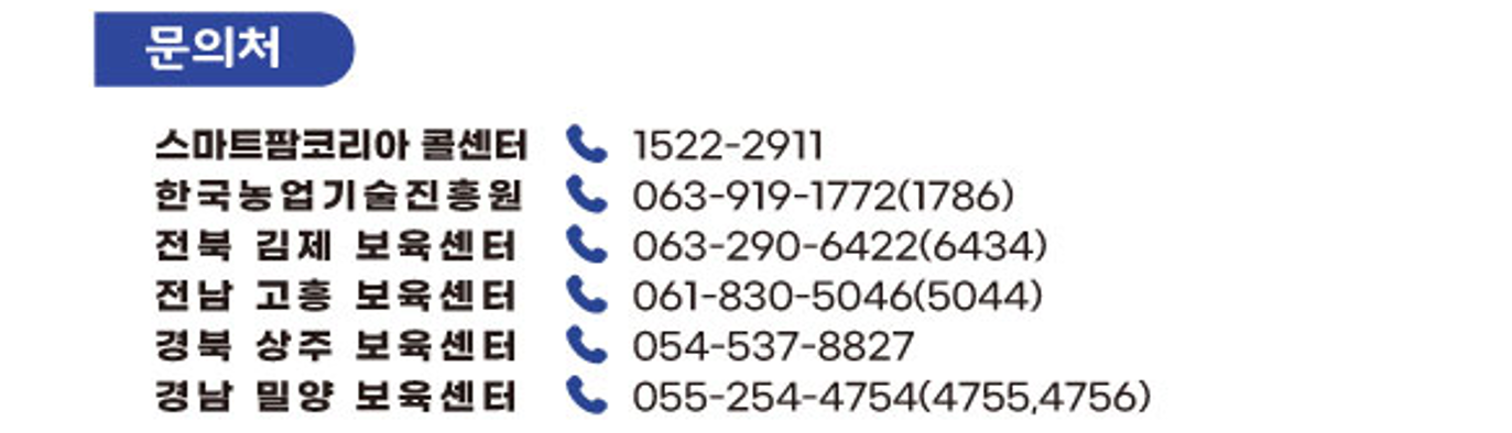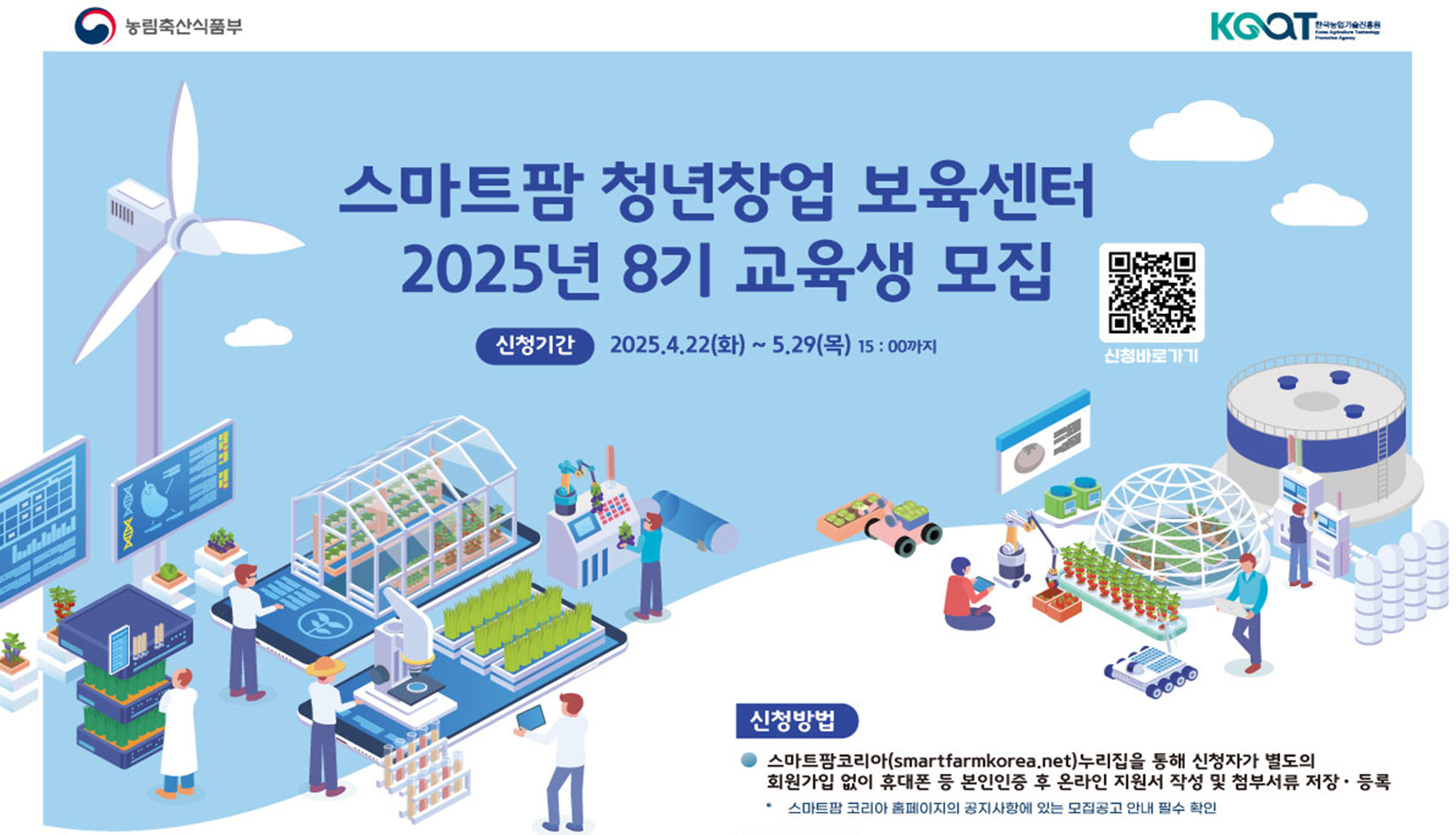 2025년 4월 22일부터 5월 29일까지 진행되는 교육생 모집! 지원은 스마트팜코리아(www.smartfarmkorea.net) 누리집을 통해 지원하실 수 있으며, 궁금한 점은 스마트팜 콜센터(☏1522-2911)로 문의해주세요. 농식품부와 함께하는 20개월간의 여정이 여러분의 인생을 바꾸는 의미 있는 시간이 되길 진심으로 응원합니다! 💪😊