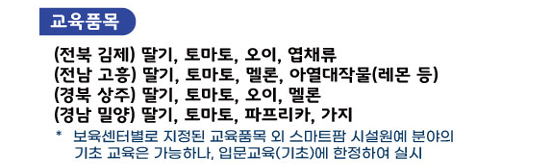 - 입문교육(2개월): 경영관리(경영·마케팅), 시설관리(스마트팜 운영, 온실관리 등), 작물생리, 품목별 재배관리, 현장견학, 전문가 특강 등 진행