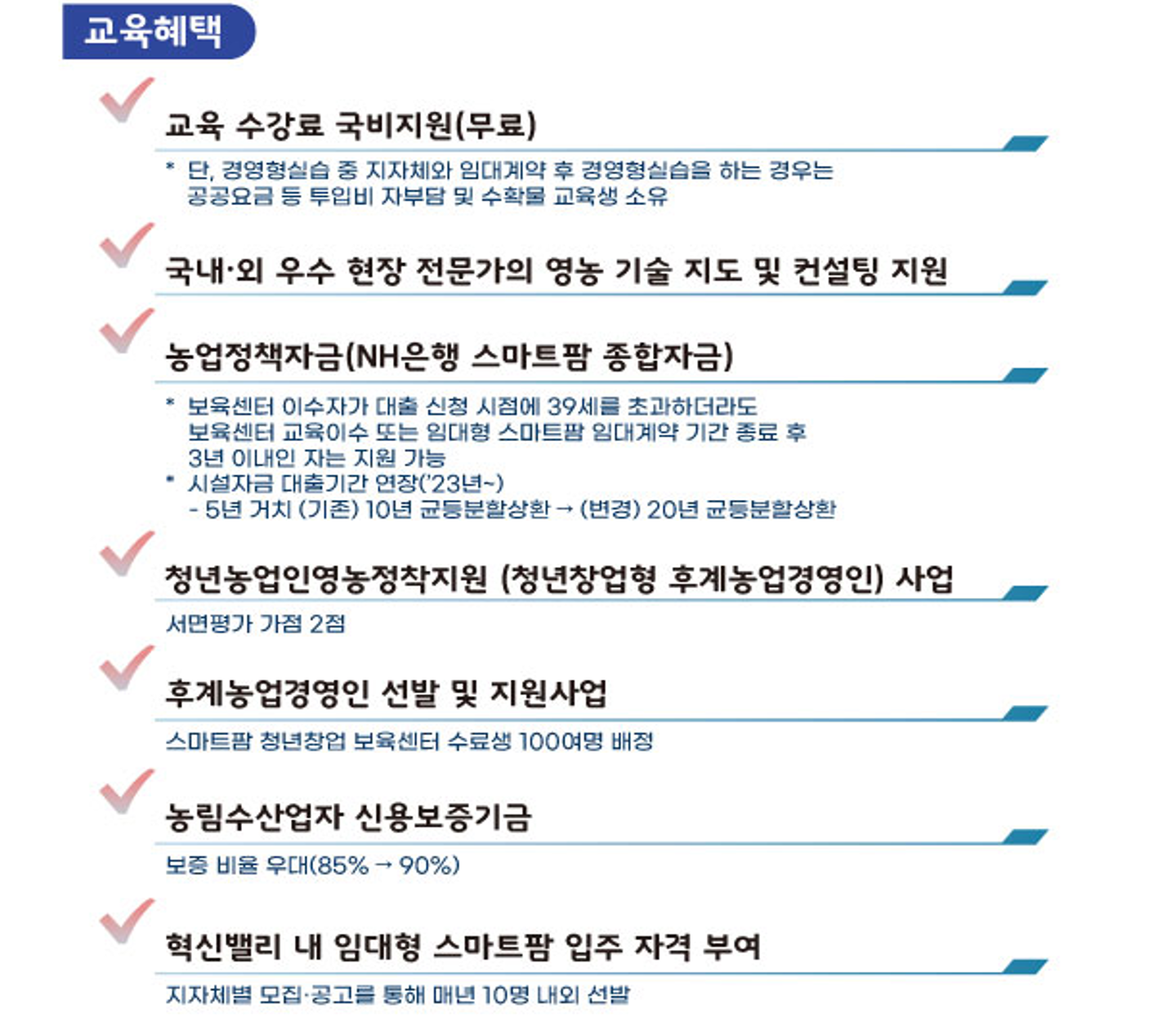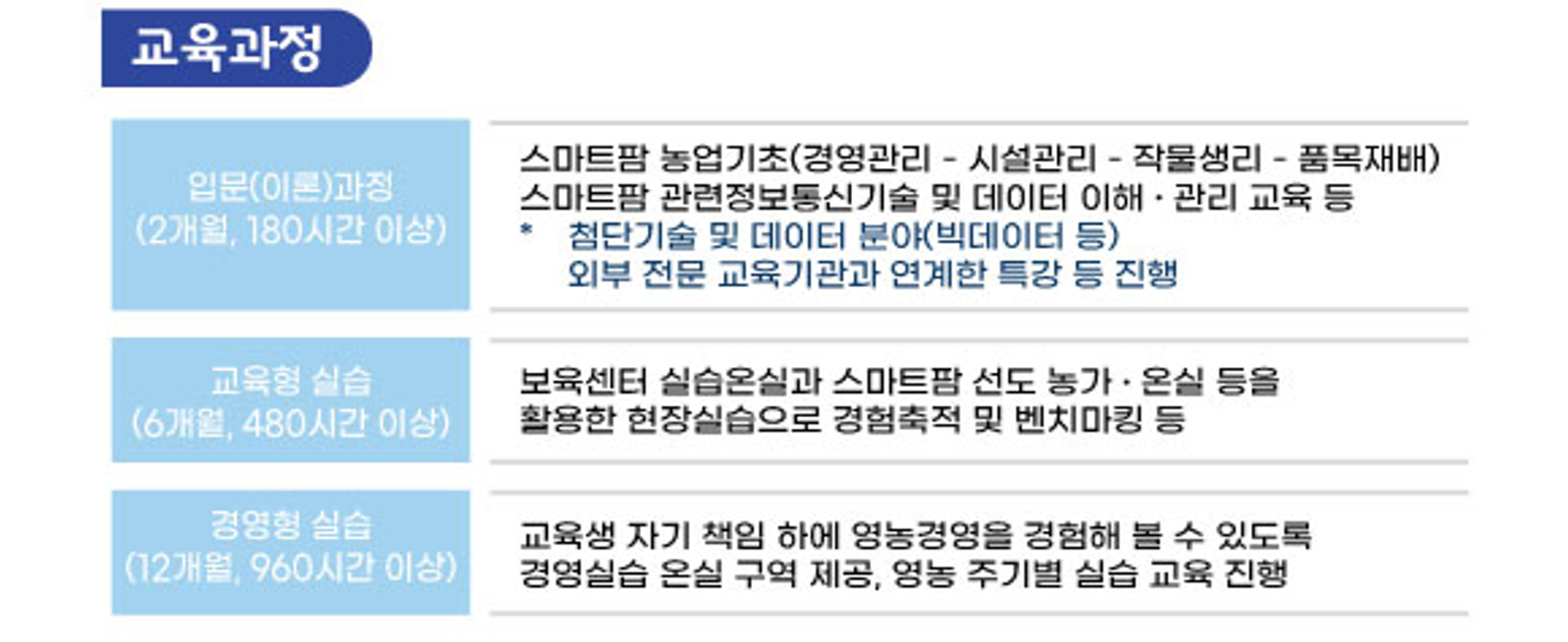 - 임대형 스마트팜 입주 자격: 교육 수행실적이 우수한 수료생은 최대 3년간 스마트팜 혁신밸리 내 임대형 스마트팜에 입주할 수 있는 자격 부여