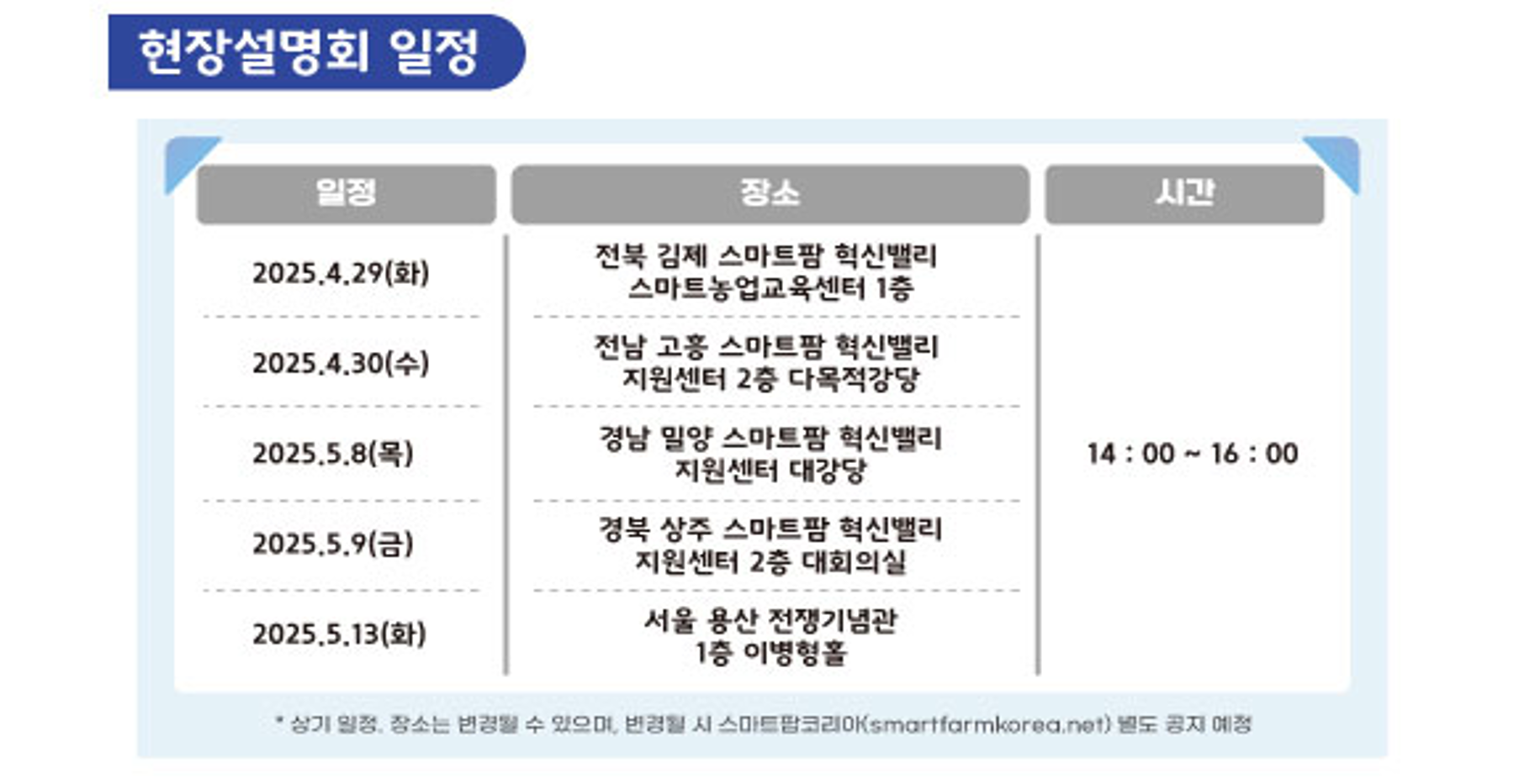 각 지역별로 현장설명회가 진행될 예정이니, 직접 현장을 방문해 시설을 둘러보고 궁금한 점을 물어볼 수 있어요. 설명회 일정은 스마트팜코리아 누리집에 게시된 교육생 모집 공고문에서 확인할 수 있으니 확인 후 꼭 참여해보세요! 👀