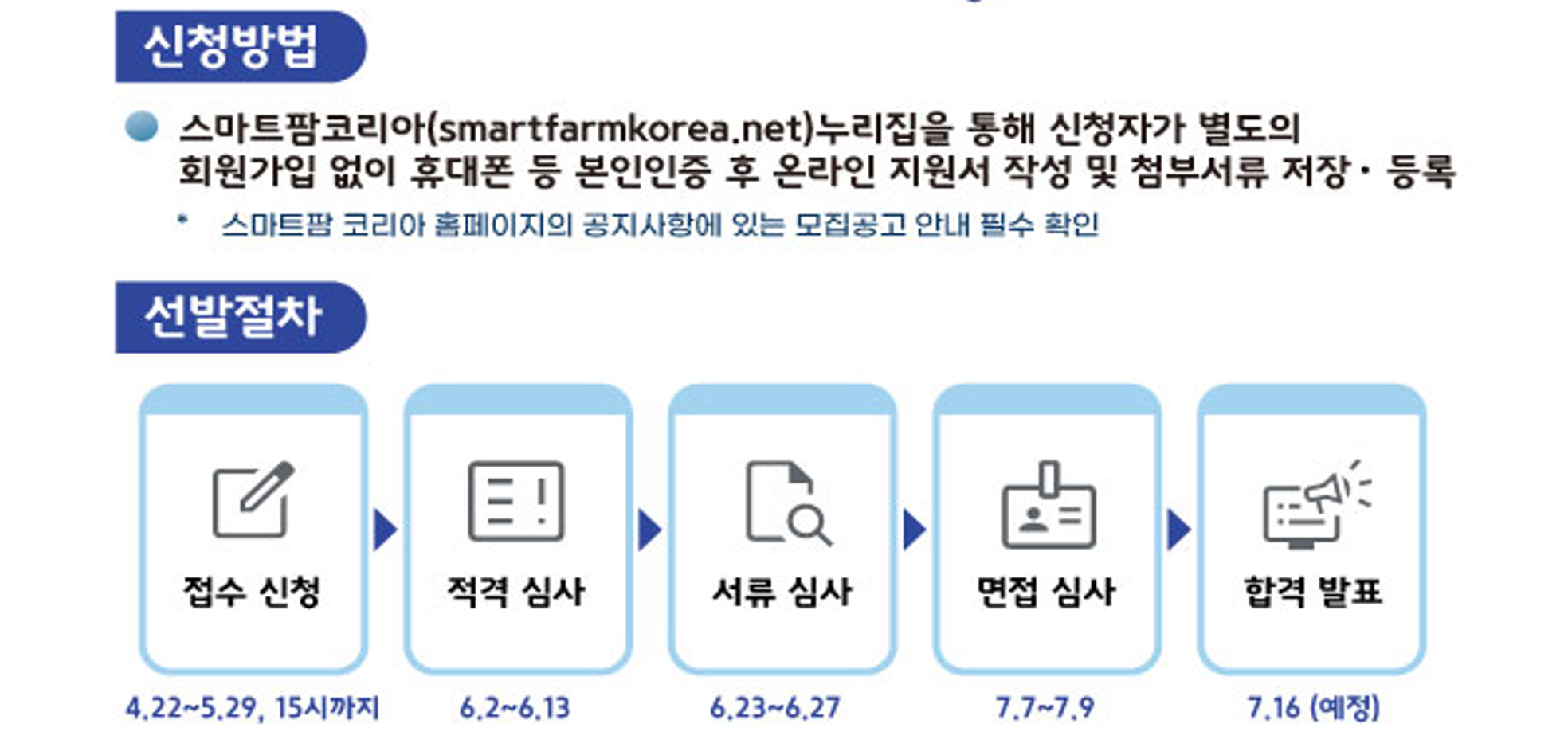 스마트팜코리아(www.smartfarmkorea.net) 누리집을 통해 별도의 회원가입 없이 휴대폰 본인인증 후 온라인으로 지원서를 작성하고 첨부서류를 등록하면 됩니다. 궁금한 점은 스마트팜 콜센터(☏1522-2911)에 문의해보세요!
