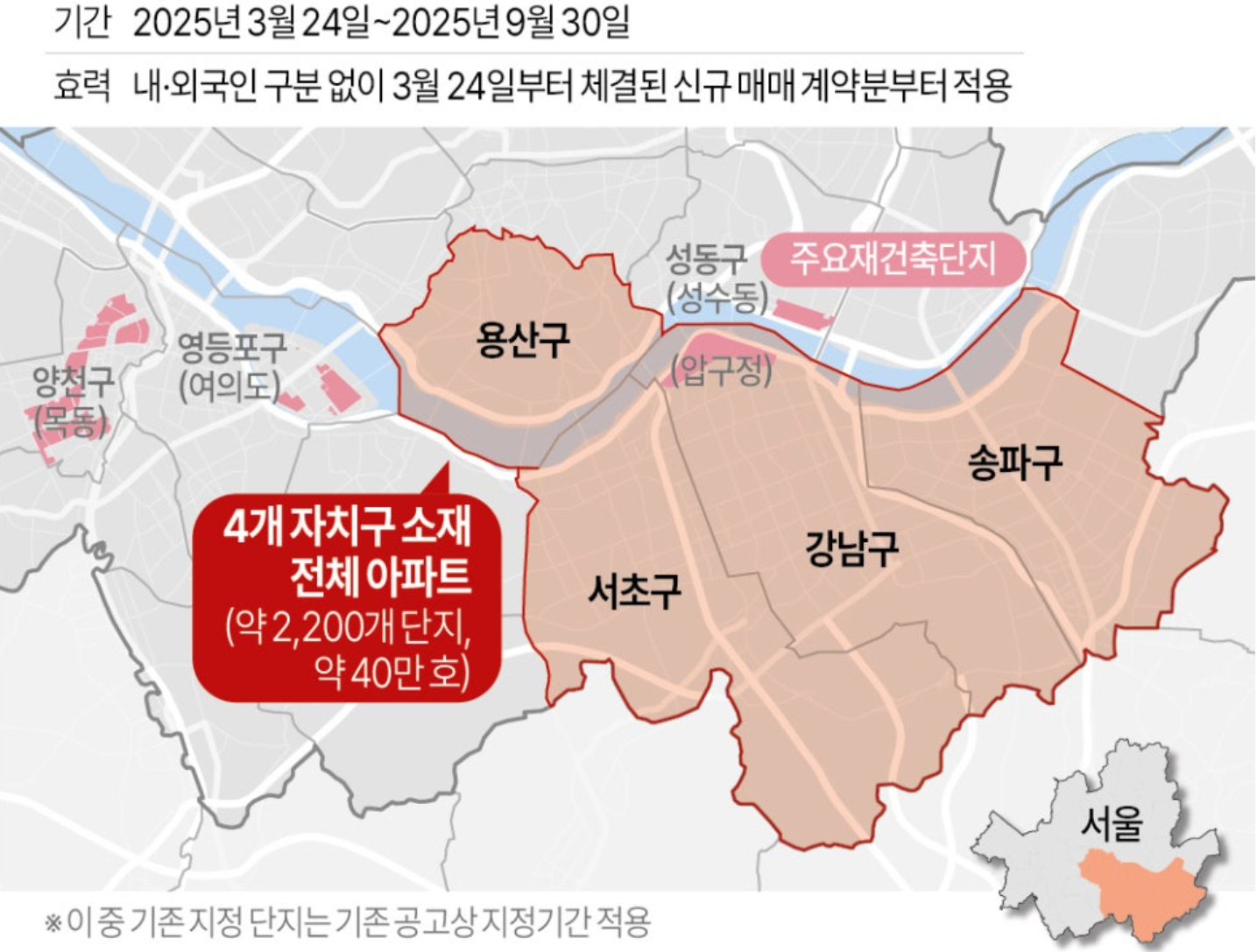 이번에 지정된 토지거래허가구역은 강남·서초·송파·용산구 소재 아파트 전체를 대상으로 하며, 지정 기간은 2025년 3월 24일부터 9월 30일까지입니다. 주거지역의 경우 6㎡, 상업지역의 경우 15㎡를 초과하는 토지 등을 취득할 때 허가를 받아야 합니다. 🏠