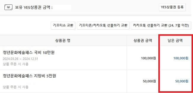 ■ 청년문화예술패스 누리집 : 마이페이지 (사용 내역은 1일 이후 반영)