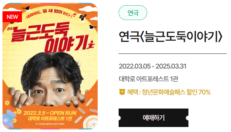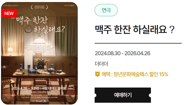 - 본인만 사용 가능하며, 같은 회차의 공연이나 전시는 1매만 예매할 수 있어요.