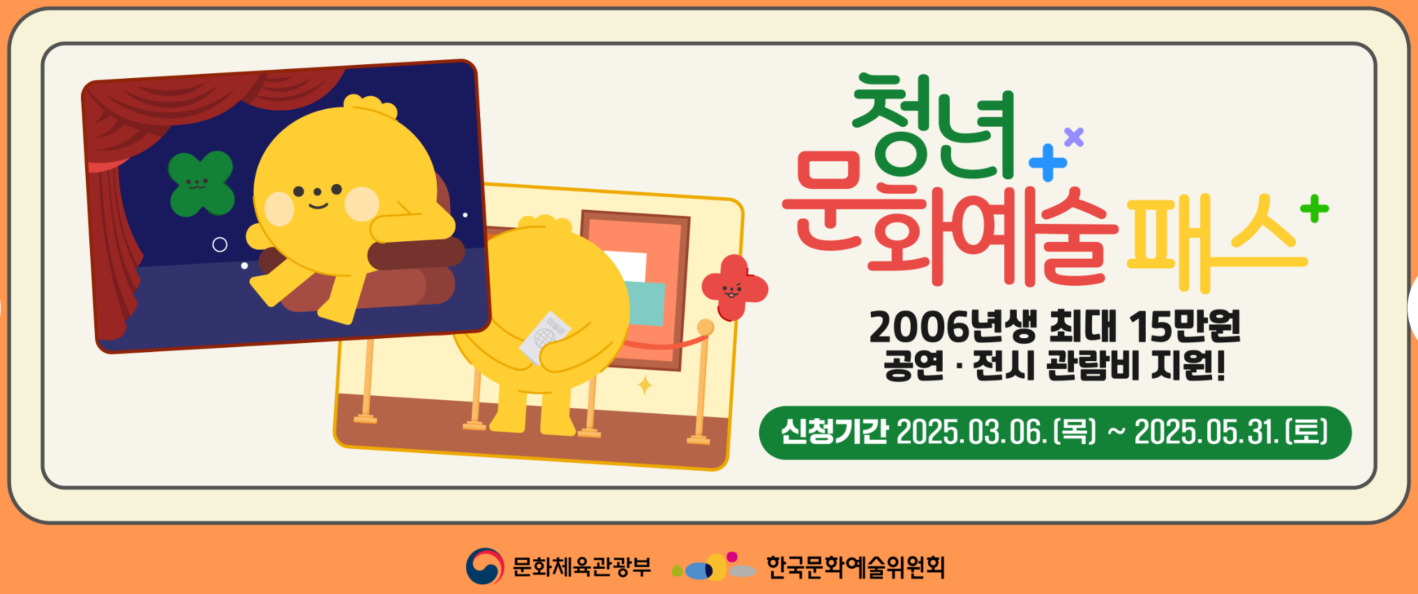 청년문화예술패스는 19세 청년들에게 문화예술 경험의 기회를 넓혀주는 소중한 지원 프로그램입니다. 사회에 첫발을 내딛는 여러분이 다양한 공연과 전시를 통해 풍부한 감성과 창의력을 키울 수 있길 바랍니다.