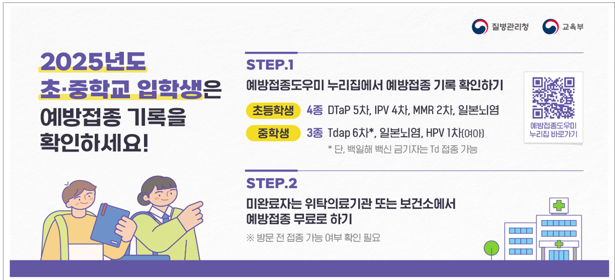 아이가 곧 초등학교, 중학교에 입학하시나요? 축하드립니다~!! 지금 기쁨과 설렘도 있겠지만 걱정도 되실거라고 생각합니다. 저희 아이는 올해 고등학교를 입학하게 되는데 기숙사생활을 하게 되었어요. 아무래도 단체생활을 갑자기 하게되다보니 질병감염 등 걱정이 되더라구요. 그래서 예방접종 소식을 접하고 미처 챙기지 못하신 부모님들이 있을것 같아 미리 체크하시면 좋겠다 싶어 정리해보았습니다.