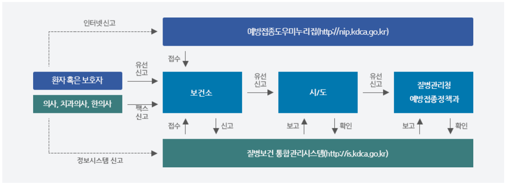- 신고방법 : 예방접종 도우미 누리집(https://nip.kdca.go.kr)에 웹 신고 또는 주소지 관할 보건소에 유선 신고