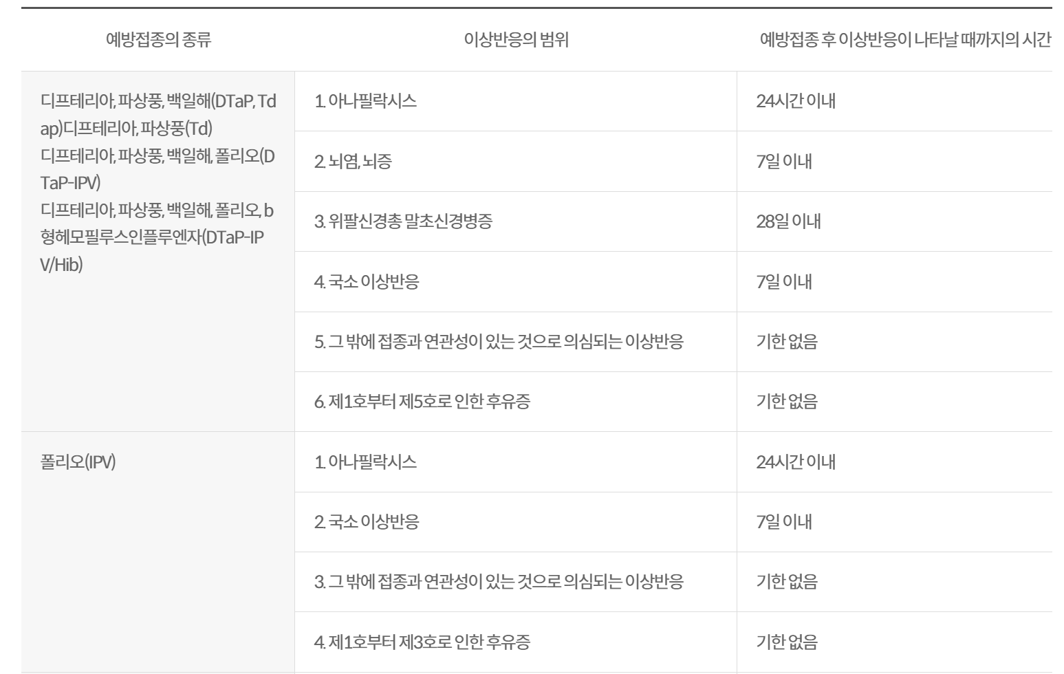 따라서 부모님들은 아래에 이상반응 범위를 보시고 해당되거나 다른 의심되는 이상반응이 있다고 판단되시면, 병원에 문의를 하셔서 대처법과 필요시 추가 진료나 응급실 방문을 상담 받으시고 신고하시길 바랍니다.
