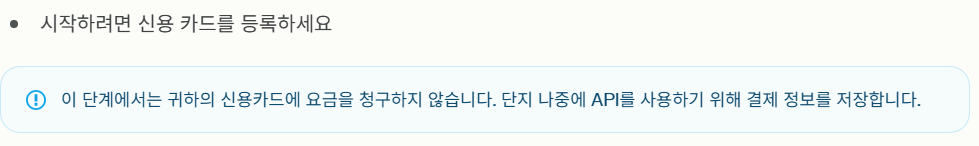 API를 무료로 사용하다보면 사용횟수를 다 쓸 경우 자동 결제되지 않고 결제를 해야 합니다. 그때를 위해 카드정보를 미리 입력한다고 생각하시면 되겠습니다.