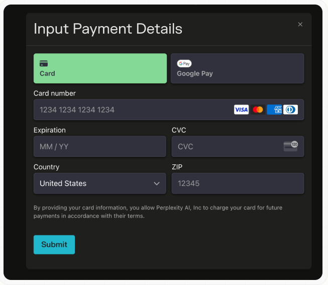 6. 카드정보를 다 입력하고 Sumit 버튼을 누릅니다.