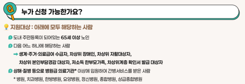 - 거주 조건과 연령: 사업 참여 시·군에 주민등록이 되어 있으며 65세 이상인 저소득계층 노인