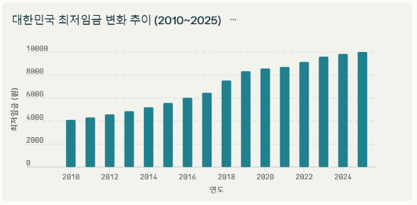 2025년 대한민국의 최저임금은 2024년 대비 170원(1.7%) 인상된 금액으로, 월 급여로 환산하면 2,096,270원(주 40시간, 월 209시간 기준)에 해당합니다. 이로써 대한민국은 최저임금제 도입 37년 만에 처음으로 시간당 1만원 시대를 열게 되었습니다